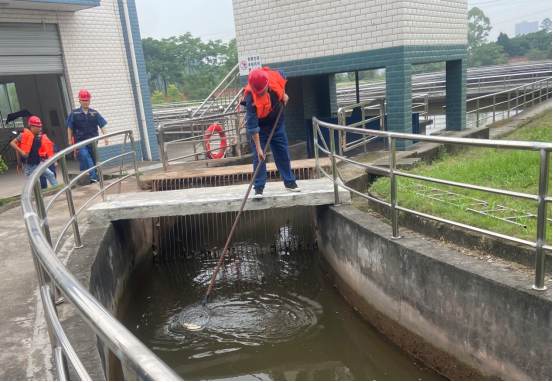 值班人員對調(diào)節(jié)池內(nèi)死魚進(jìn)行打撈