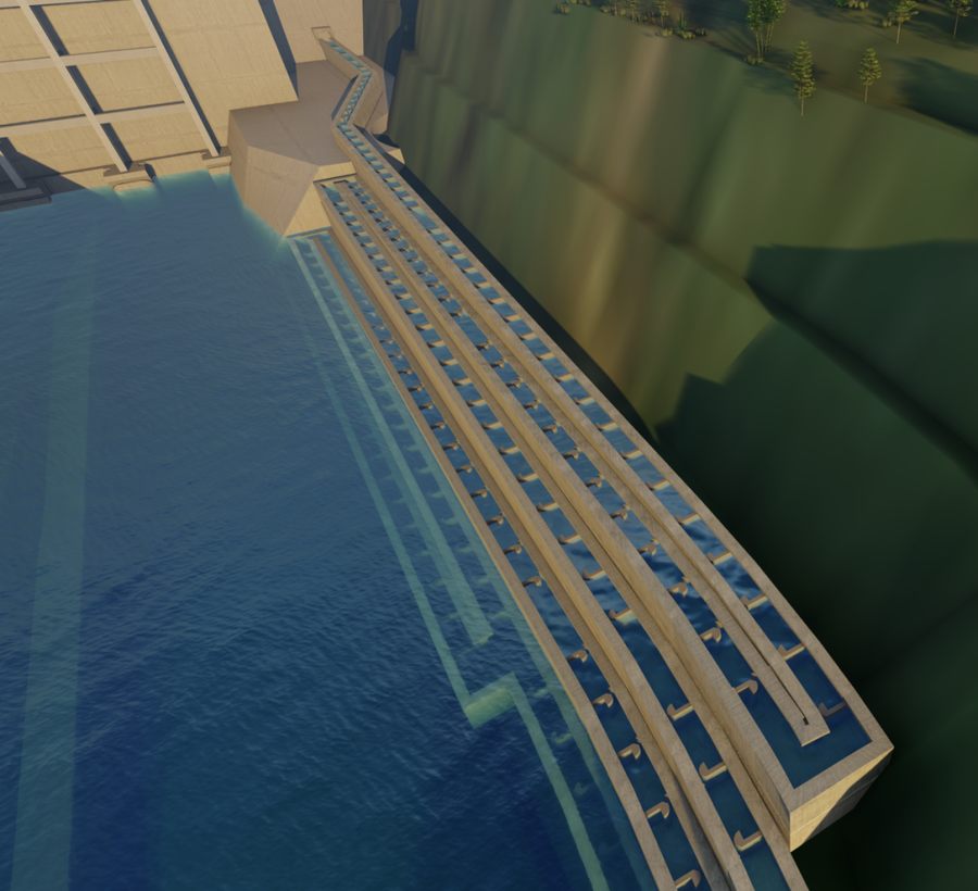 黃石盤(pán)水庫(kù)魚(yú)道工程采用了一種能夠適應(yīng)庫(kù)水位變幅的升魚(yú)塔結(jié)構(gòu),該結(jié)構(gòu)已獲得國(guó)家實(shí)用新型專(zhuān)利。升魚(yú)塔結(jié)構(gòu)采用升船機(jī)的原理,自動(dòng)控制升魚(yú)塔內(nèi)水位的自由升降,實(shí)現(xiàn)升魚(yú)塔內(nèi)水位與上游水庫(kù)任意水位銜接,達(dá)到了魚(yú)類(lèi)通過(guò)升魚(yú)塔自由進(jìn)入上游水庫(kù)的目的。